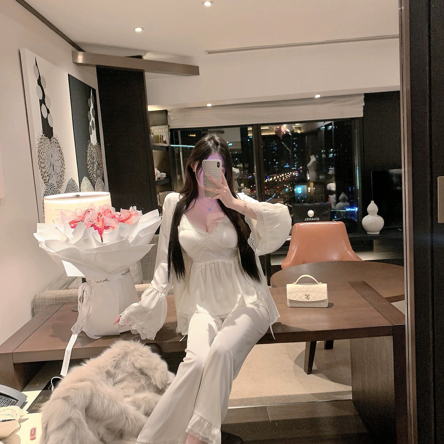赵露思许妍同款春秋睡衣女冰丝长袖黑色带胸垫三件套大码蕾丝家居