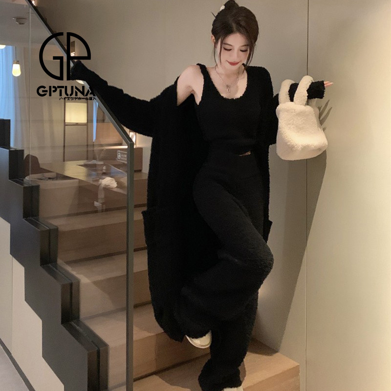 日本GP半边绒软绵绵睡衣女冬季黑色性感吊带三件套睡袍加厚家居服