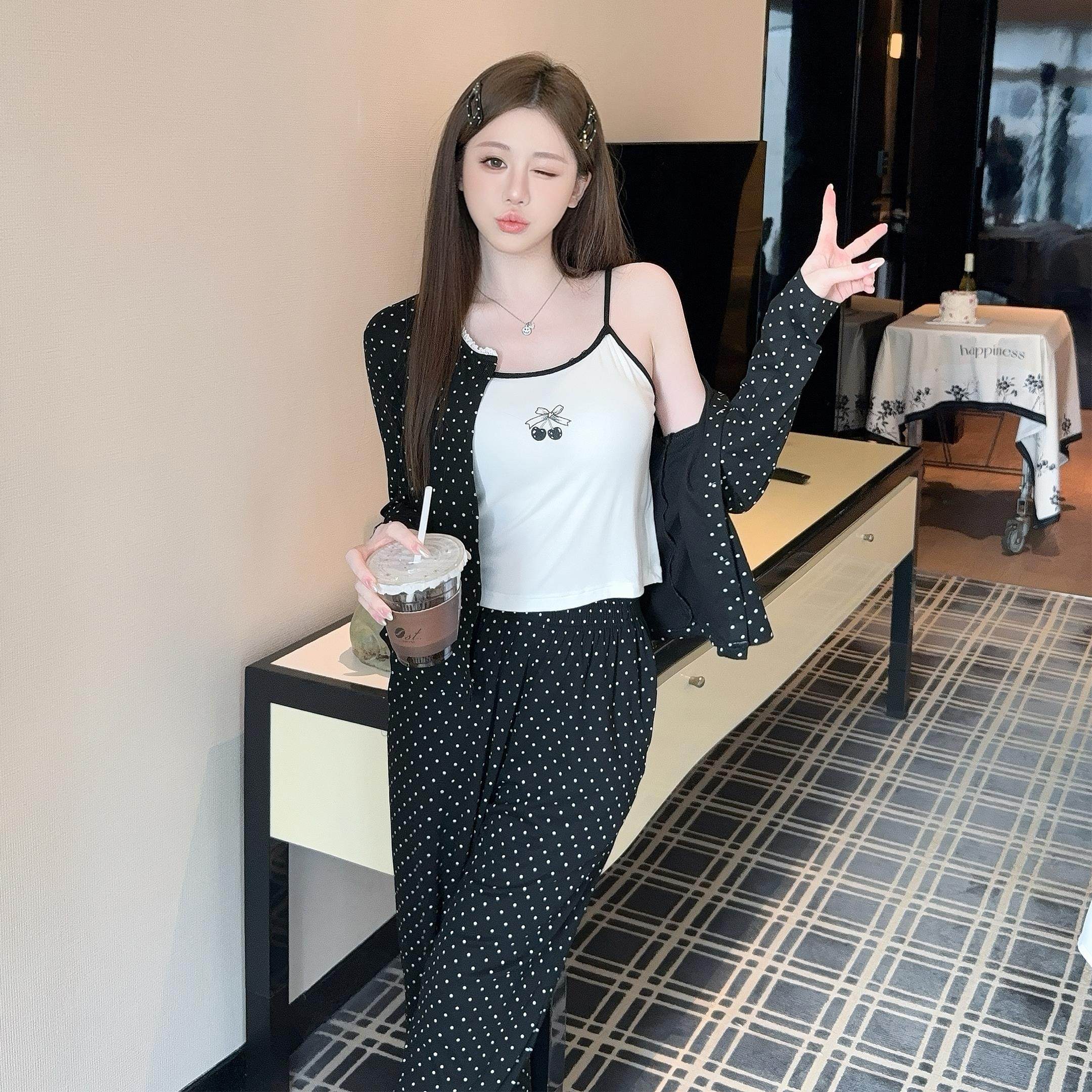 INS风波点碎花睡衣女春秋黑色莫代尔三件套复古慵懒带胸垫家居服