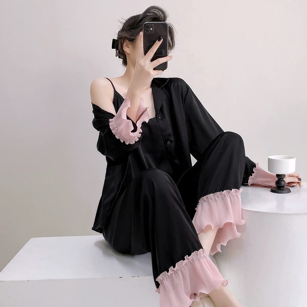 乐姿梦冰丝荷叶边性感睡衣女长袖春秋款三件套装高级感黑色家居服