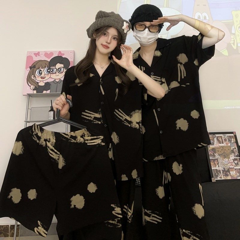 情侣款睡衣女高级黑色扎染夏季男纯棉短袖宽松家居服三件套可外穿
