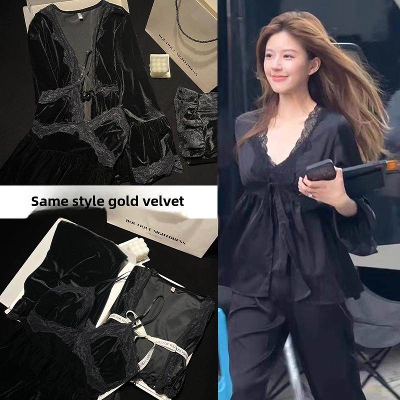 高级感黑色吊带金丝绒三件套睡衣女蕾丝秋冬季带胸垫可外穿家居服