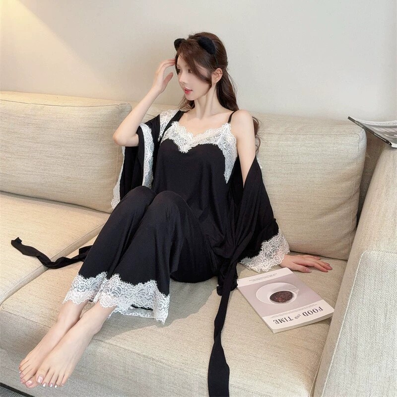莫代尔棉性感黑色蕾丝吊带睡衣女三件套长袖长裤可外穿家居服套装