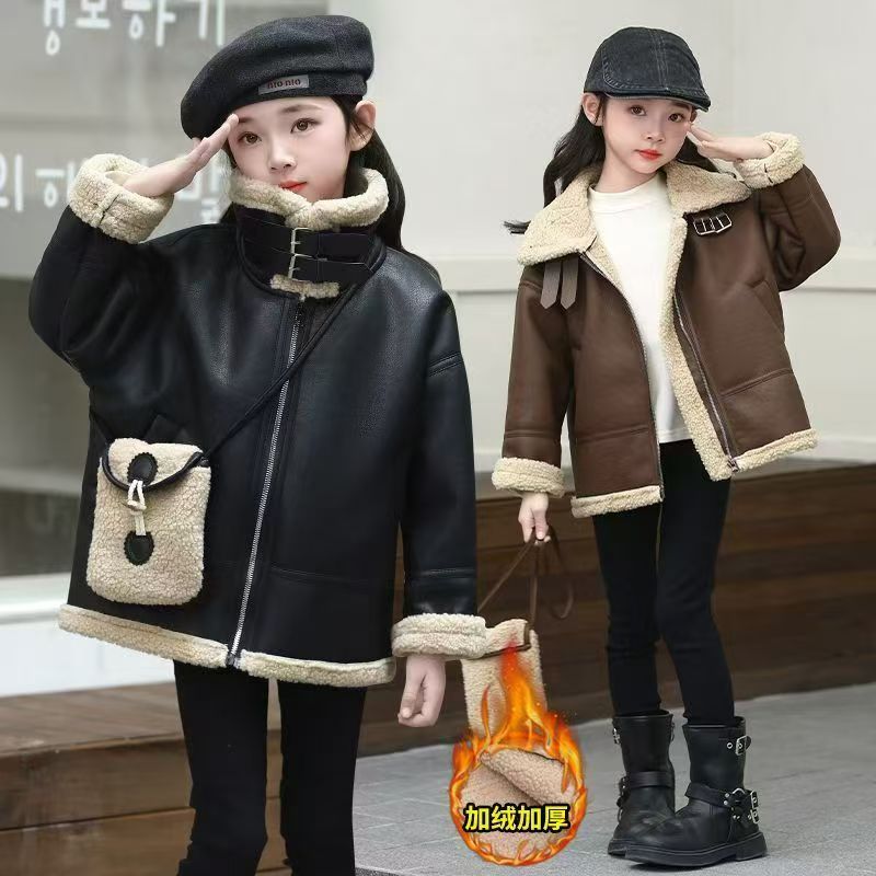 女童皮衣外套冬季新款儿童羊羔绒皮毛一体加绒加厚潮酷夹克上衣潮