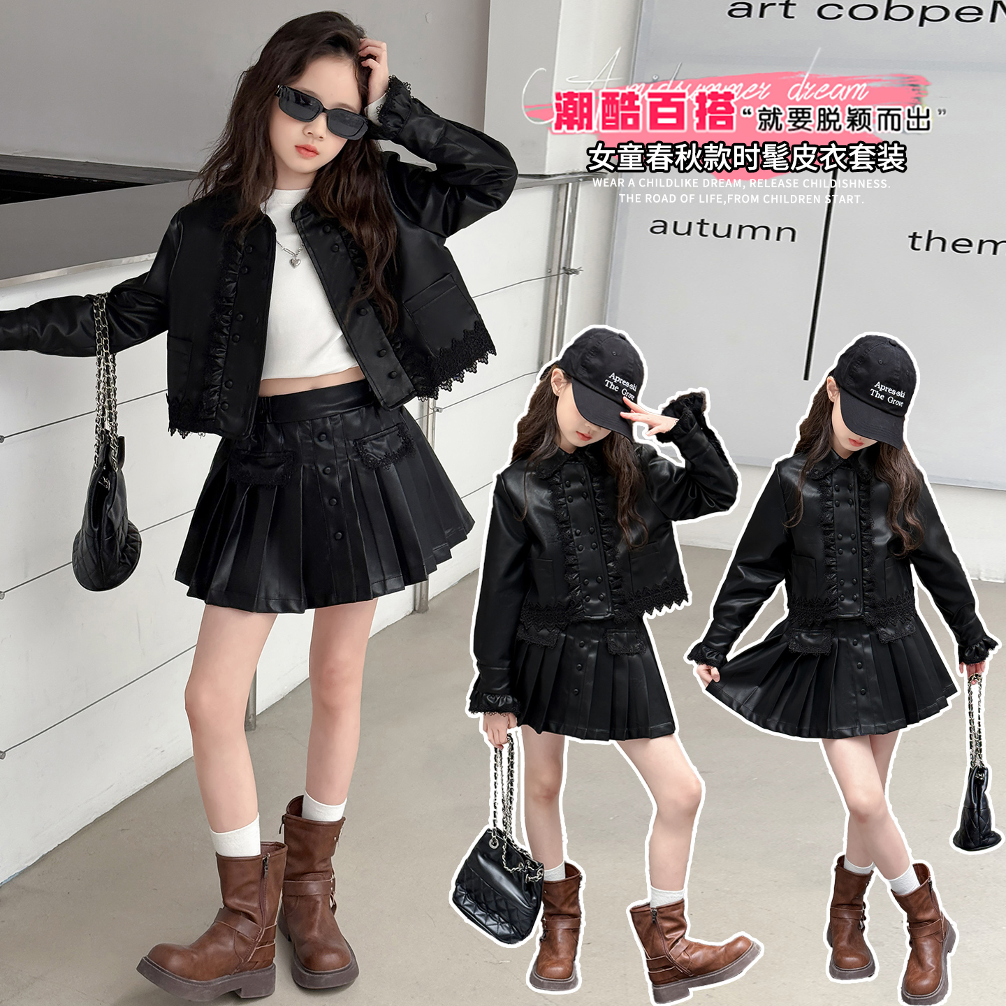 女童皮衣外套2025新款春秋装儿童洋气时髦中大童韩版花边皮衣套装