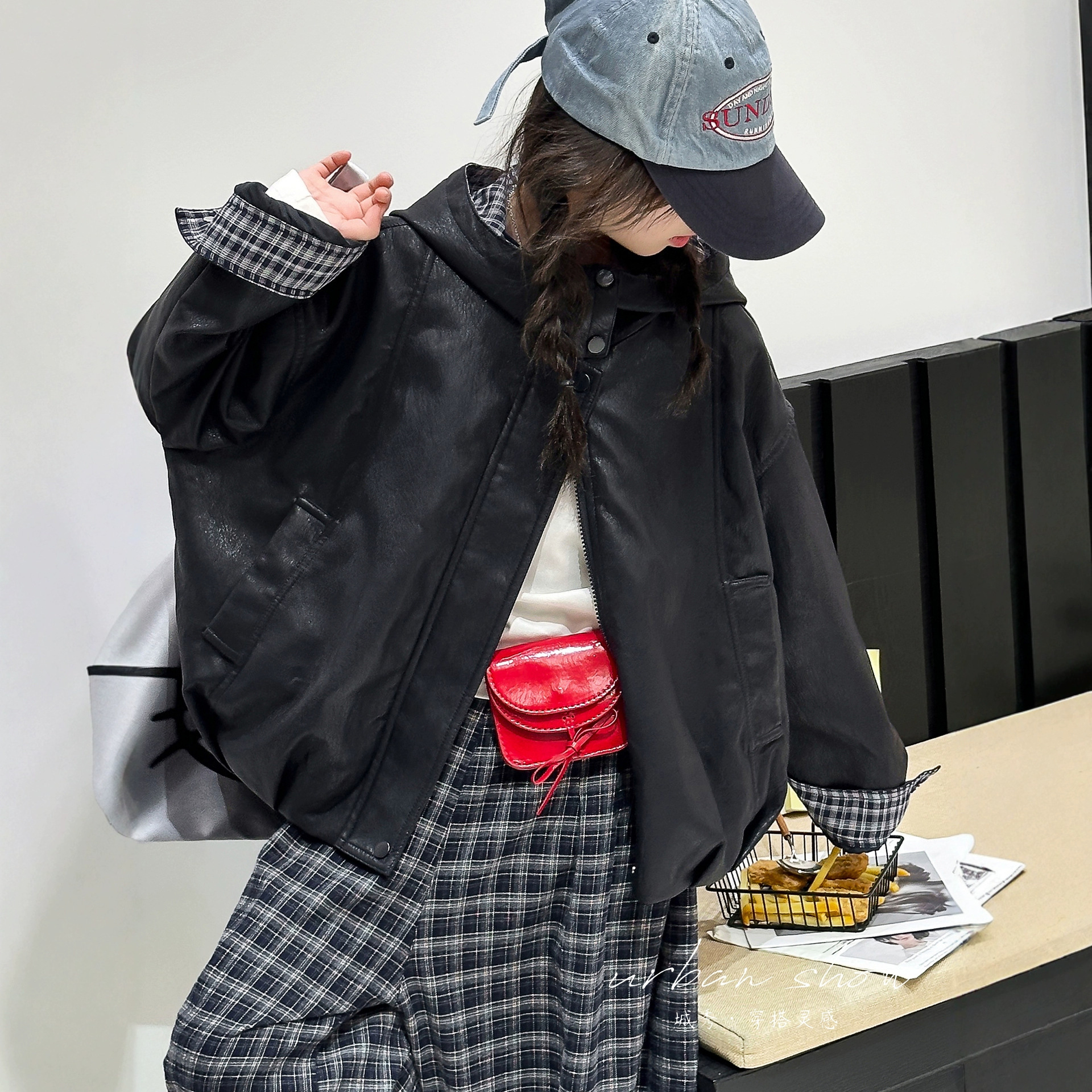 女童皮衣外套2025新款春秋洋气时髦中大童韩版假两件连帽皮夹克上
