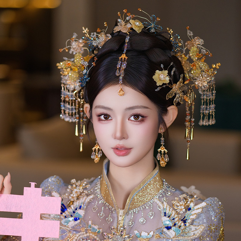 秀禾头饰新娘中式旗袍盘发发夹侧边马面裙发饰山茶花蝴蝶汉服配饰