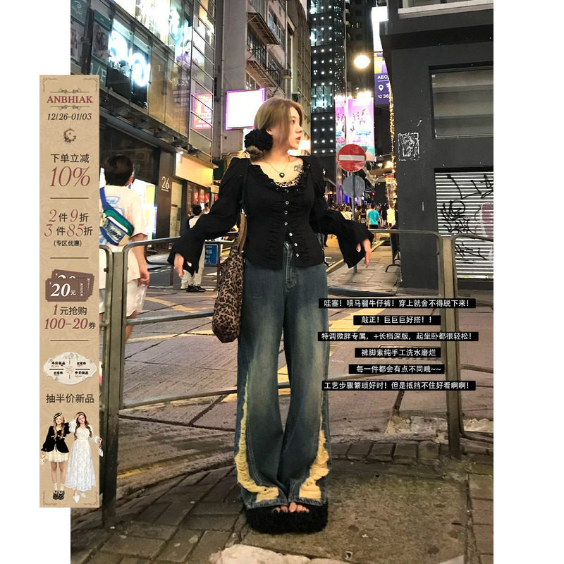 安妮不火 设计感复古做旧破洞牛仔裤女2024早秋新款微胖大码裤子