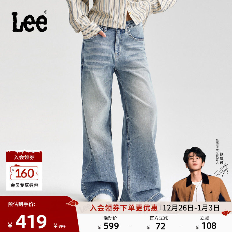 【张凌赫代言】Lee25秋冬新品舒适破洞设计复古浅蓝女阔腿牛仔裤