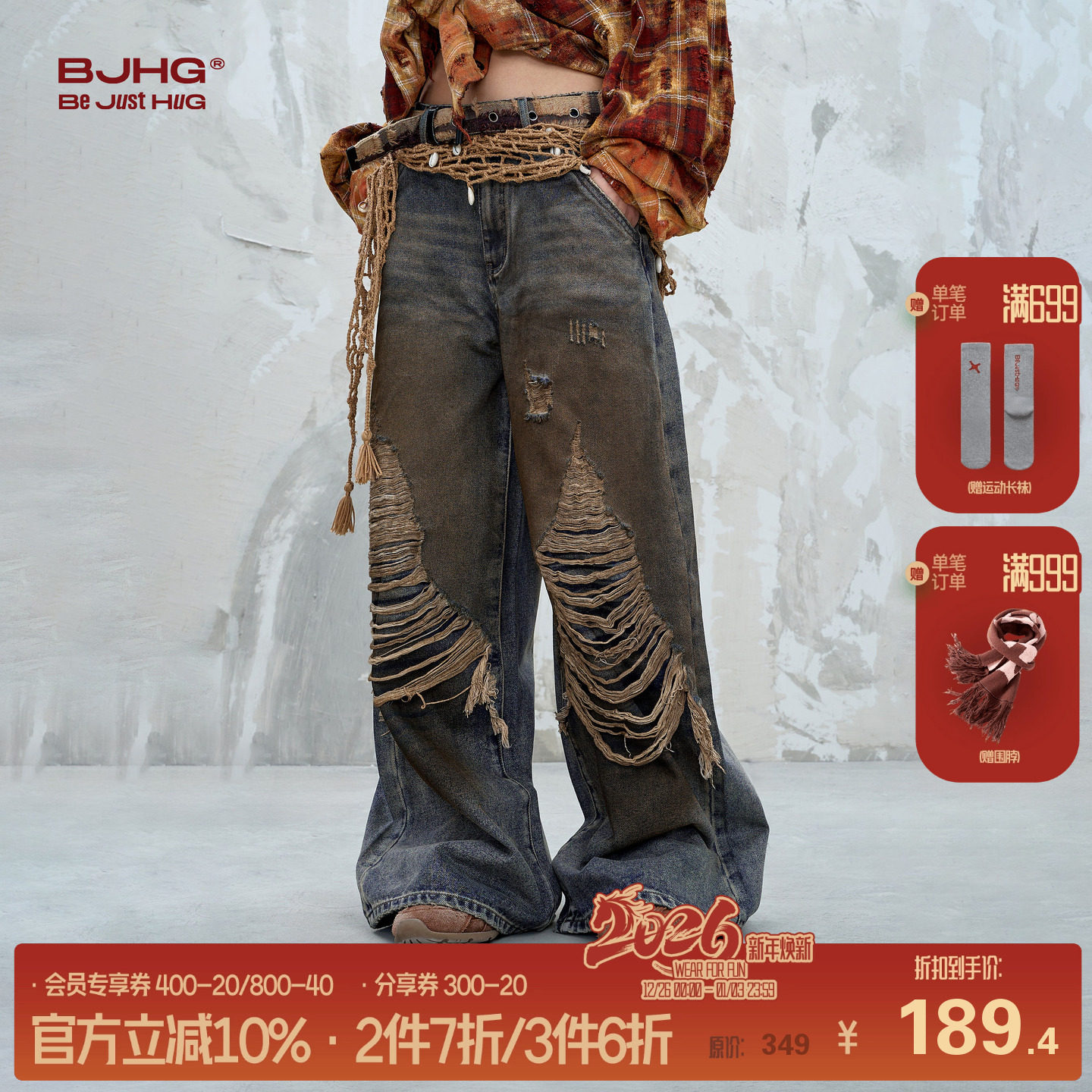 BJHG不计后果复古水洗做旧破洞牛仔裤女秋冬季美式直筒阔腿休闲裤