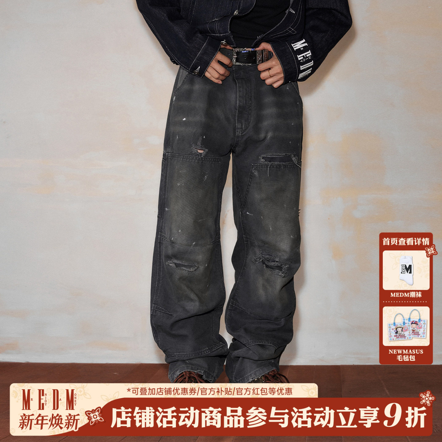 MEDM 春秋破洞水洗休闲拉链工装裤美式街头设计感男女同款直筒裤