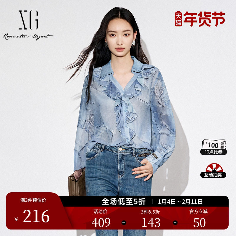 XG雪歌个性印花长袖套头衬衫时尚秋季新款荷叶花边拼接休闲上衣女