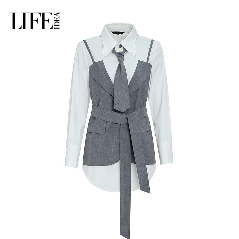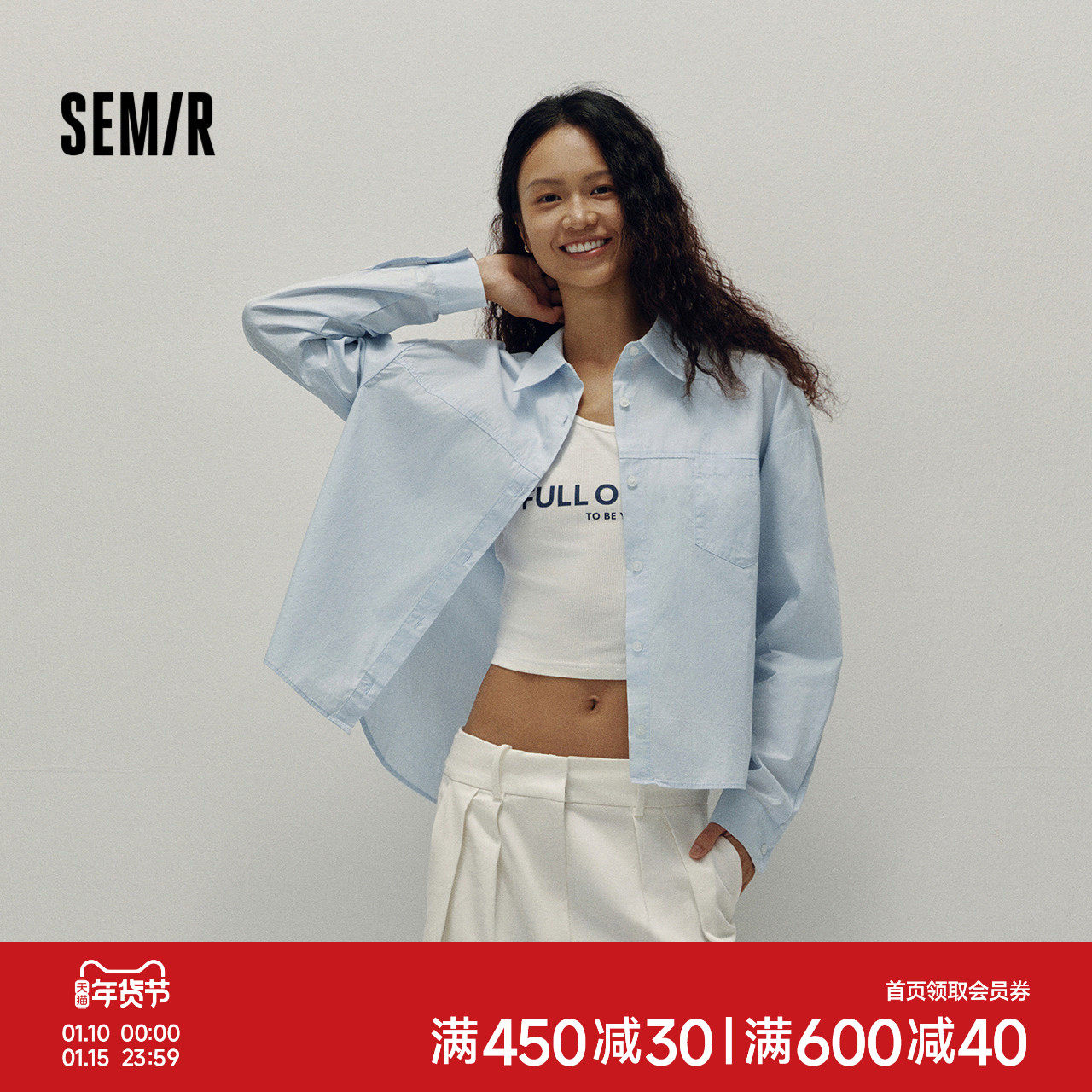 森马长袖衬衫女简约宽松衬衣字母印花短背心个性潮流秋通勤两件套