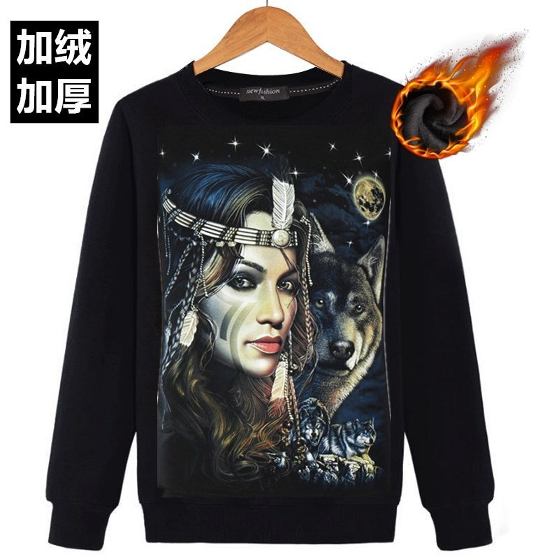 秋款男装个性3D立体美女狼宽松加绒加厚长袖全棉卫衣男衬衫保暖衣