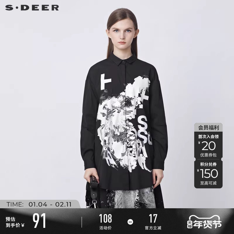 sdeer圣迪奥冬装女装个性翻领撞色印花黑色长袖衬衫S21480513
