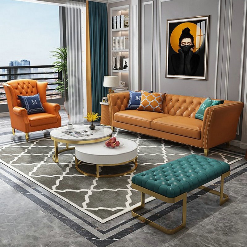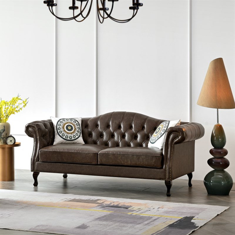 美式真皮沙发棕色客厅三人焦糖色皮沙发复古拉扣直排单人家具轻奢