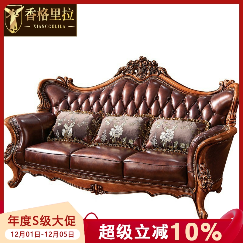 欧式美式真皮沙发 全实木橡木头层牛皮别墅大户型123双面雕花沙发