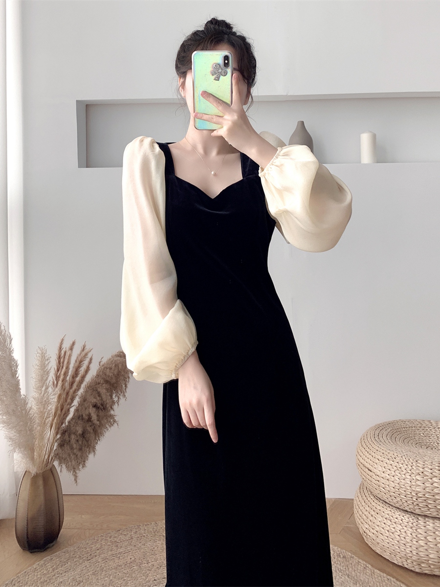 金丝绒方领连衣裙女秋冬轻奢小众高端宴会平时可穿礼服裙生日聚会