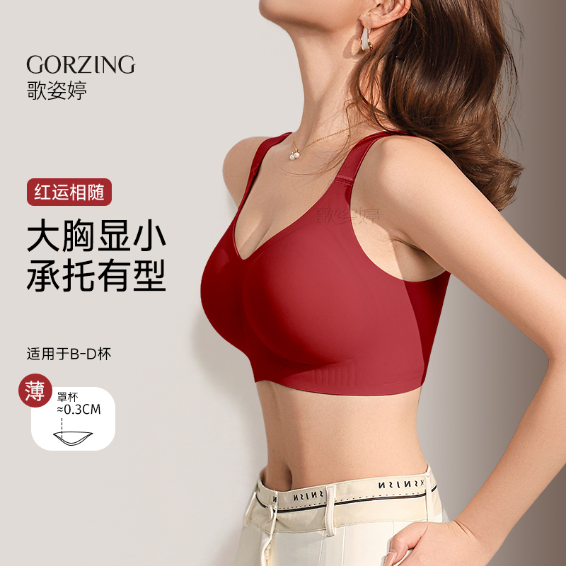 红色本命年内衣女薄款大胸显小防下垂软钢圈光面小胸聚拢文胸套装