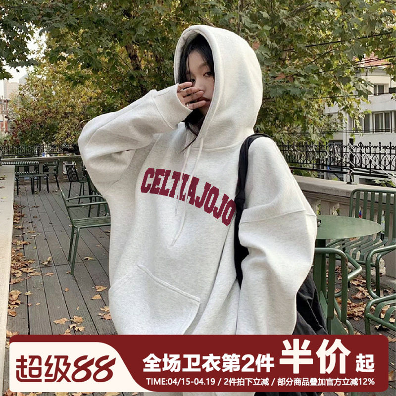 美式复古oversize灰色套头连帽卫衣女2026新款bf大码秋冬加绒潮牌