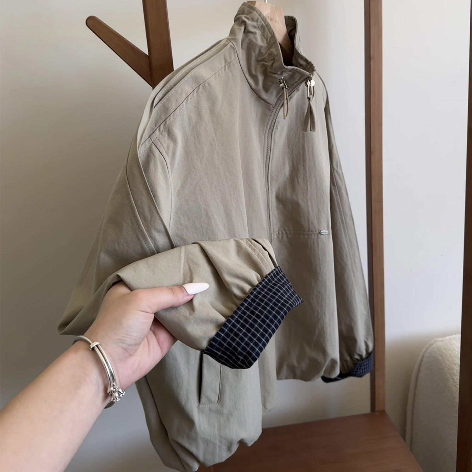 原物推荐!原宿风立领格子拼接冲锋衣外套女款小个子休闲夹克上衣