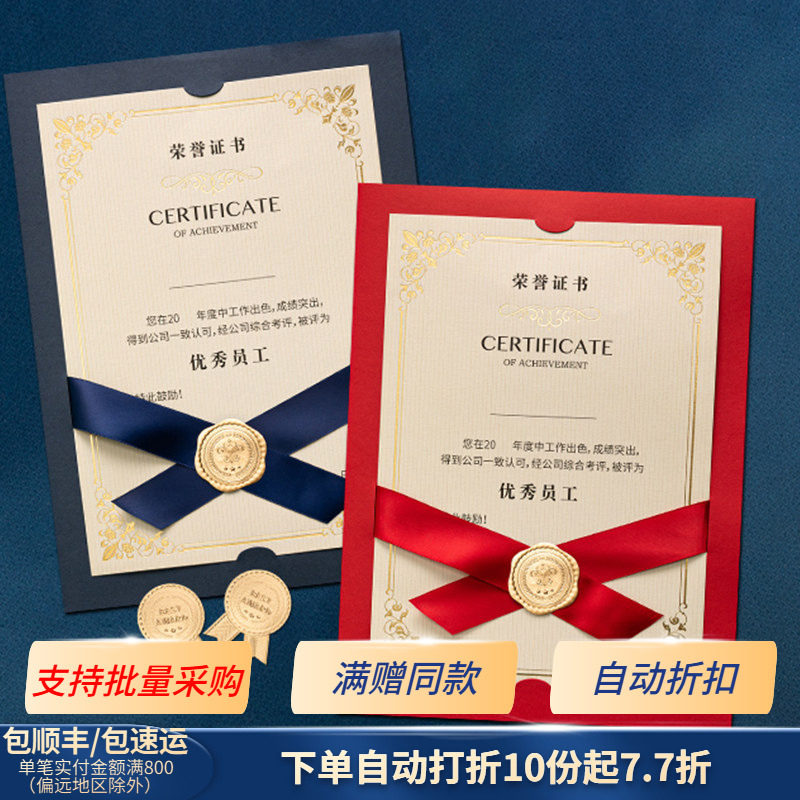 荣誉证书定制A4内芯页优秀员工打印高档丝带封皮外壳封套结业证书