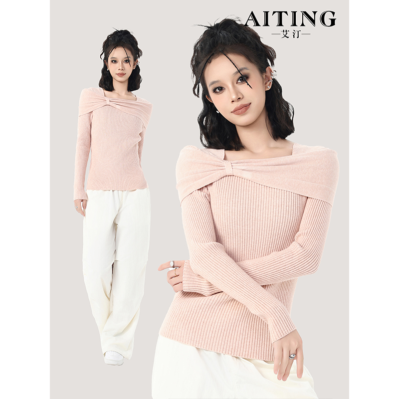 Miorastudio法式复古气质柔雾粉针织上衣 一字肩翻领长袖温柔毛衣