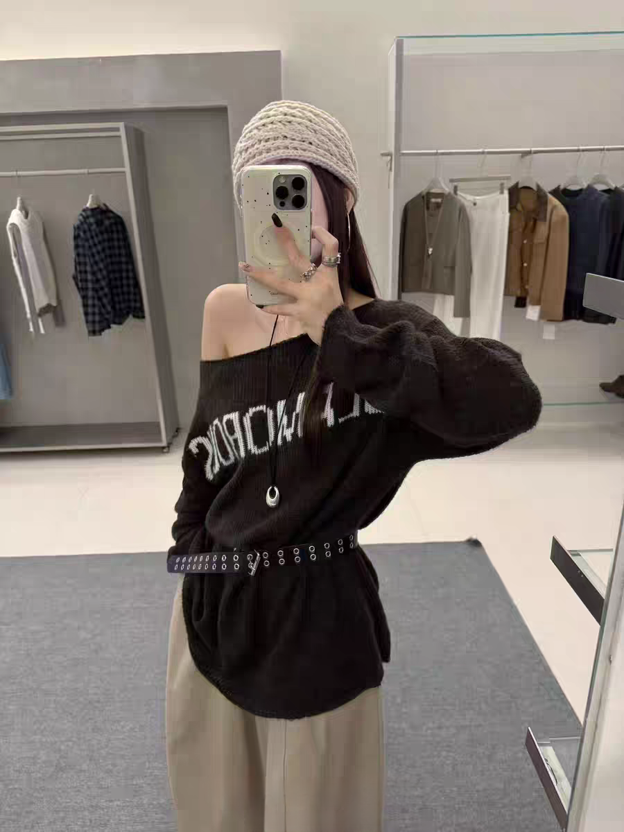韩系慵懒感极简一字领针织毛衣女秋宽松显瘦露肩斜肩上衣.配腰带