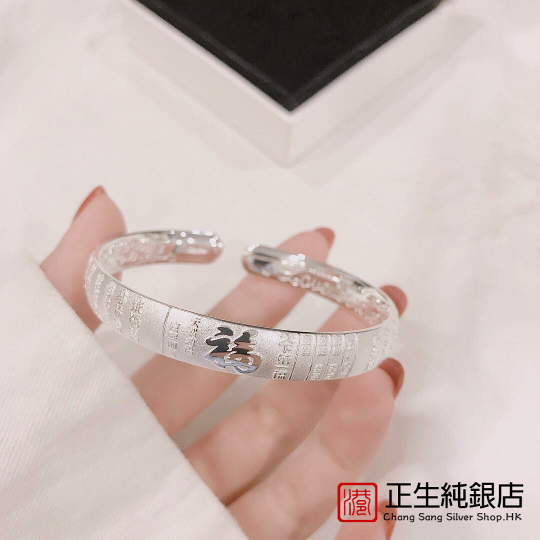 香港正生纯银中国风磨砂手环S999足银闪砂心经开口手镯女士送妈妈