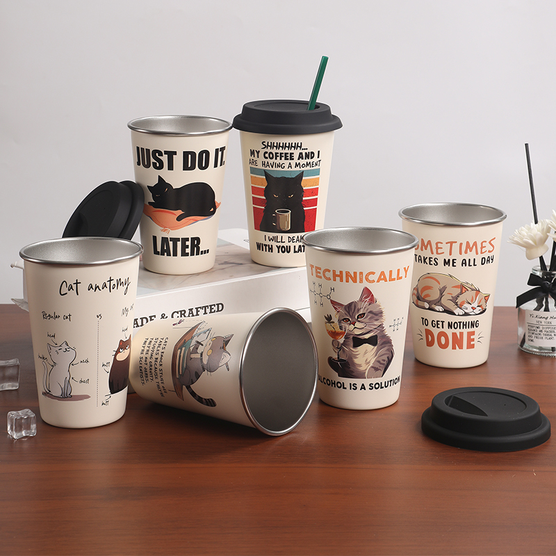 个性创意随手杯带盖咖啡杯防摔单层不锈钢ins高颜值可爱猫咪杯子