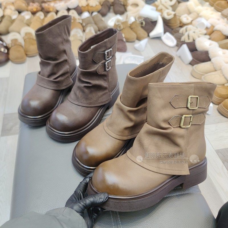 美丽誓言女鞋2025冬季粗跟单里短靴子烟筒靴皮带扣马丁靴109-56