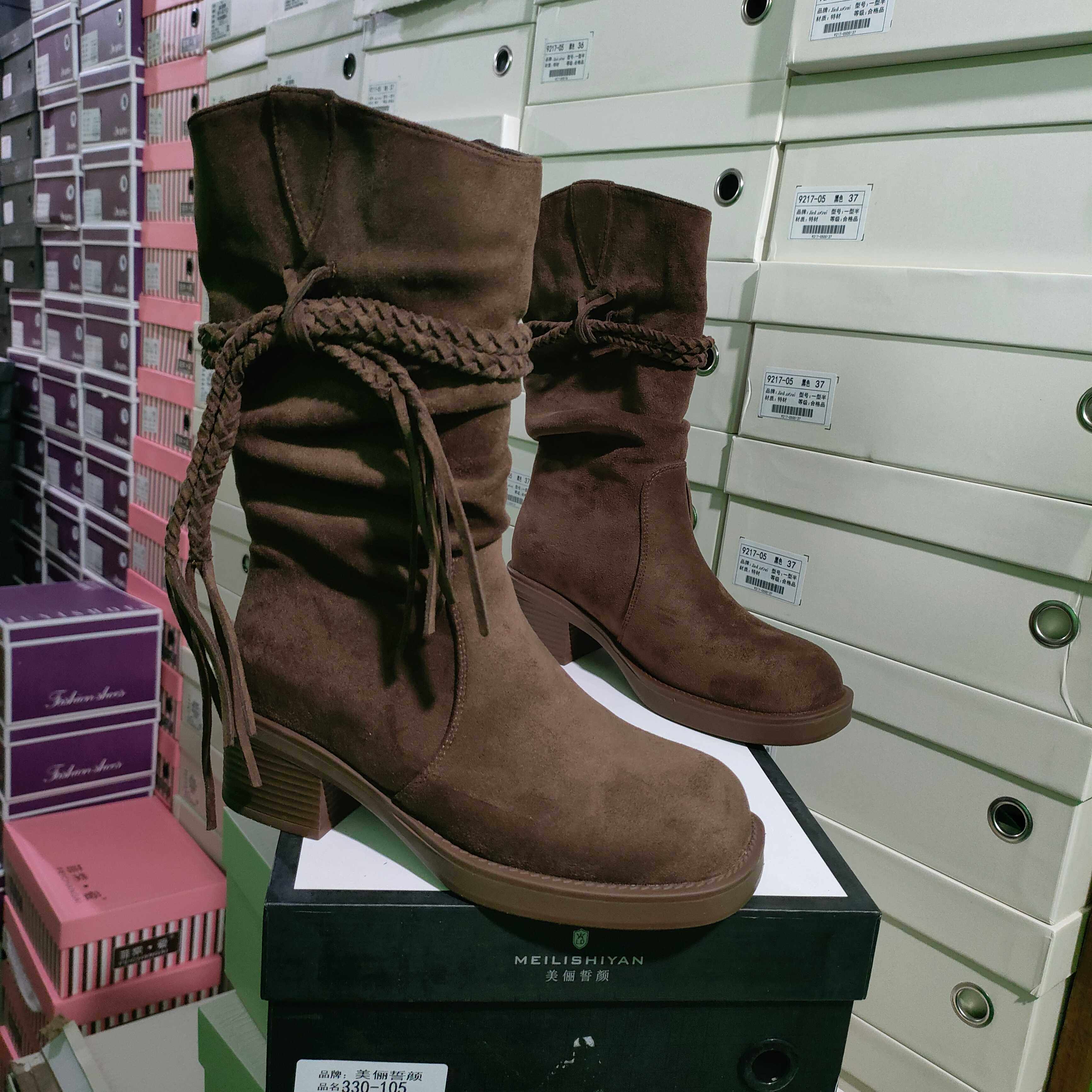 实体店女鞋2025秋冬流苏堆堆靴中筒粗跟西部单靴美丽誓言330-105