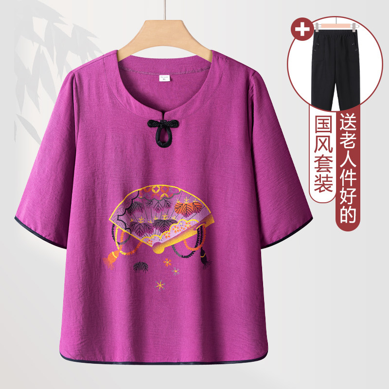 中老年人女夏装套装奶奶中袖上衣妈妈国风老人衣服两件套太太唐装