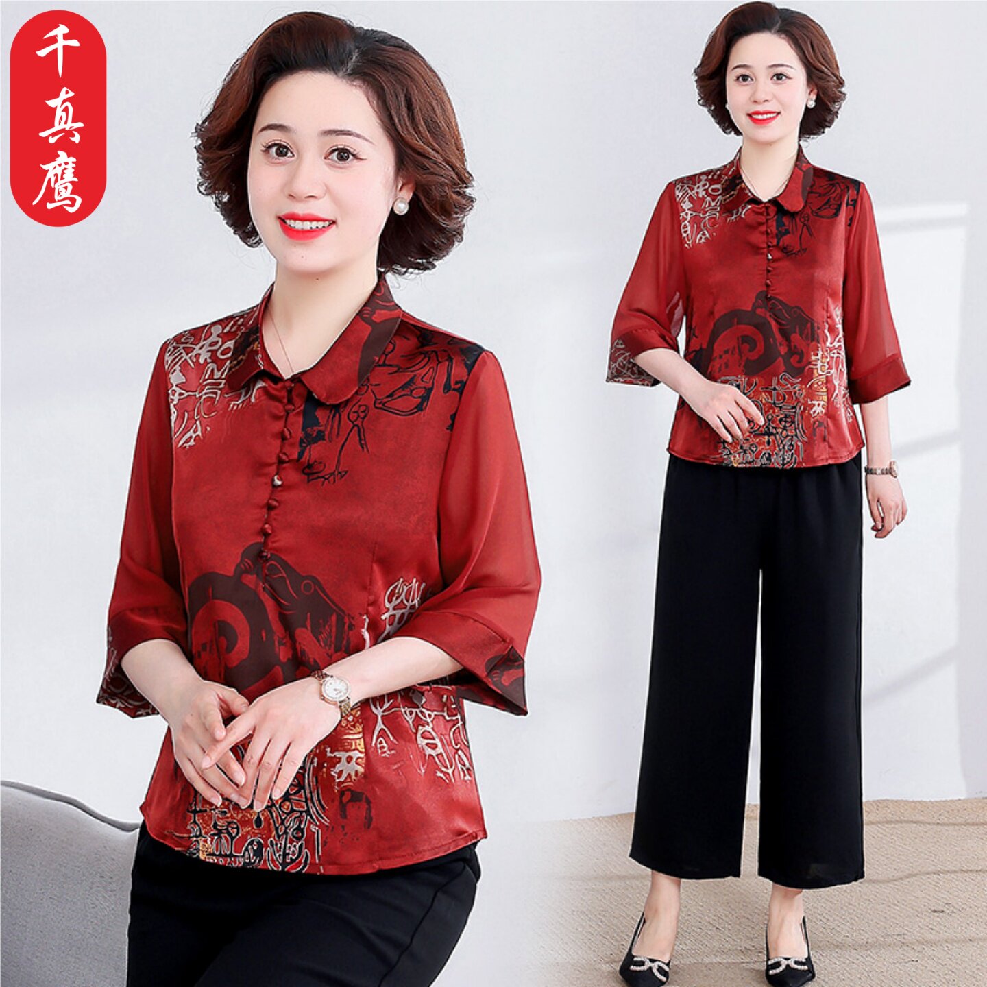 母亲节桑蚕丝妈妈夏装套装新款洋气小衫大码上衣中年衣服真丝衬衫
