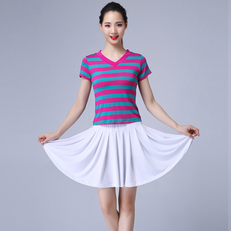杨丽萍广场舞服装女夏装套装新款裙子条纹上衣短袖中老年跳舞衣服