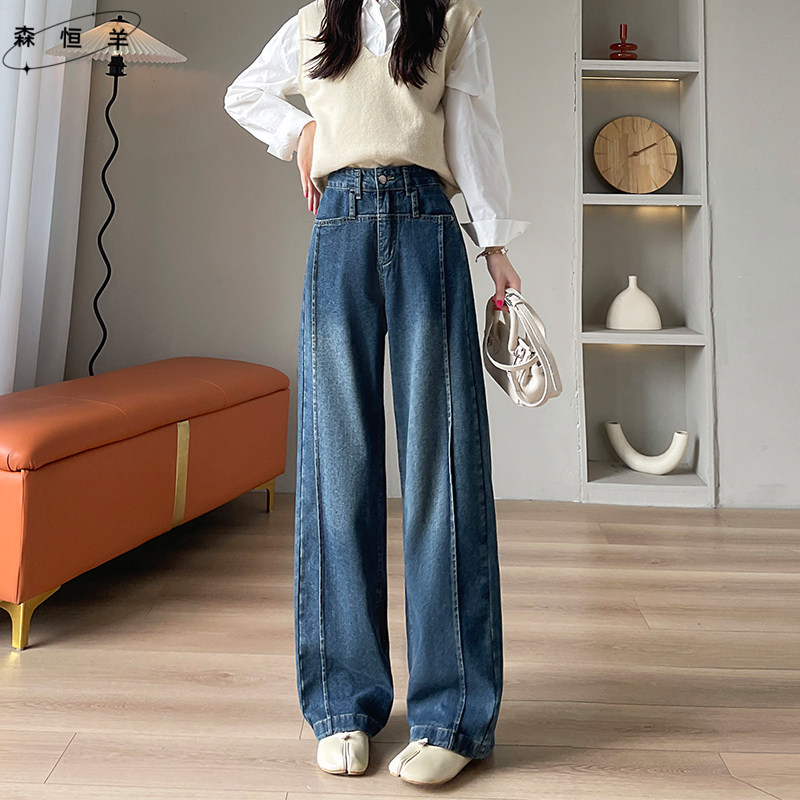 高腰复古蓝牛仔裤女春秋新款长裤显瘦韩版垂感拖地窄版阔腿裤女子