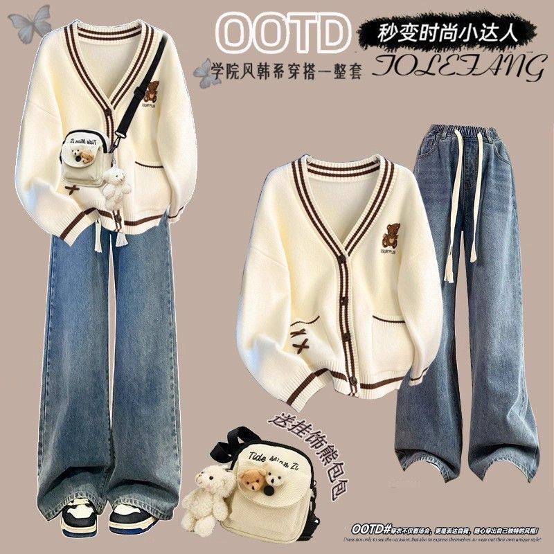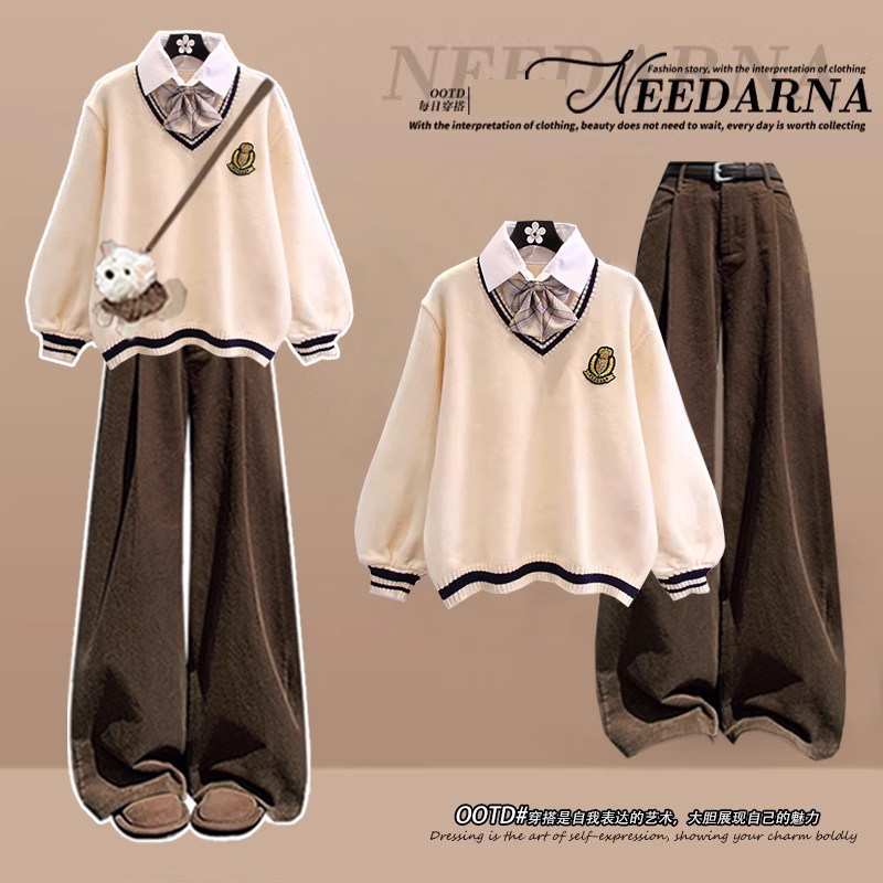秋冬季温柔系韩版穿搭学院慵懒风针织衫毛衣阔腿裤学生三件套装女