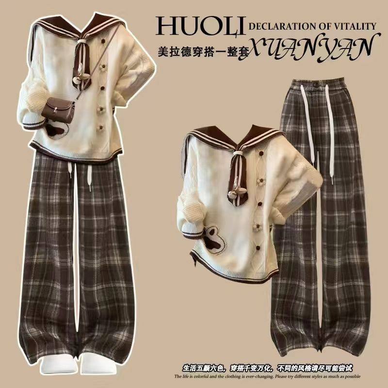 冬季美拉德套装女学生韩版宽松学院风可爱长袖毛衣+格子裤两件套