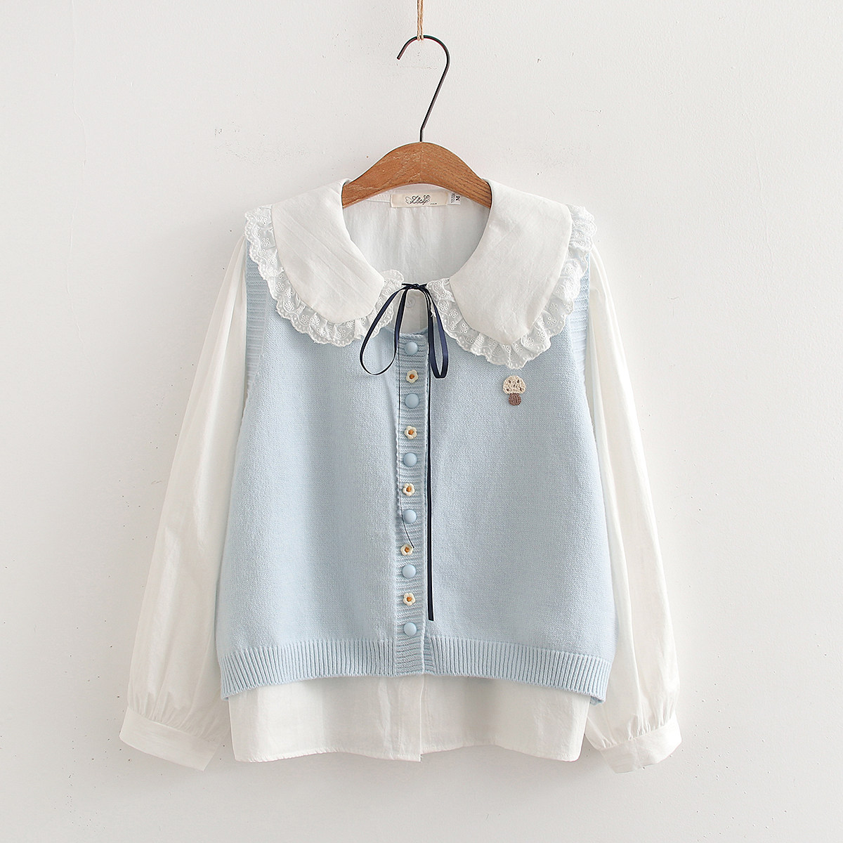 韩版少女甜美学院风娃娃领衬衫长袖针织马甲两件套女春季叠穿套装