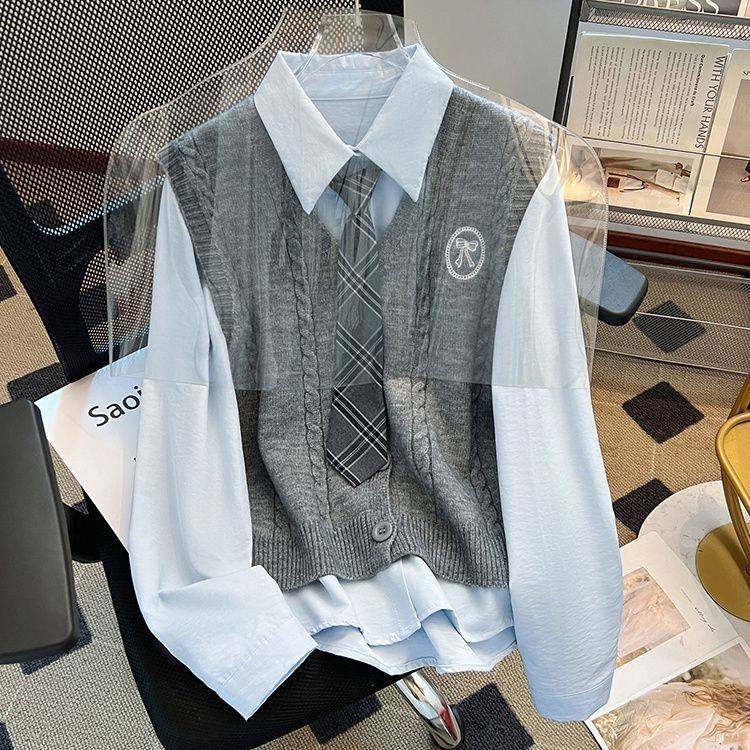 针织马甲女2025新款韩版宽松甜美清新学院风长袖衬衫学生两件套