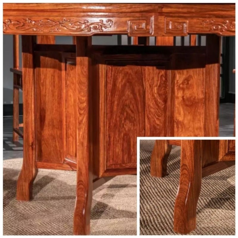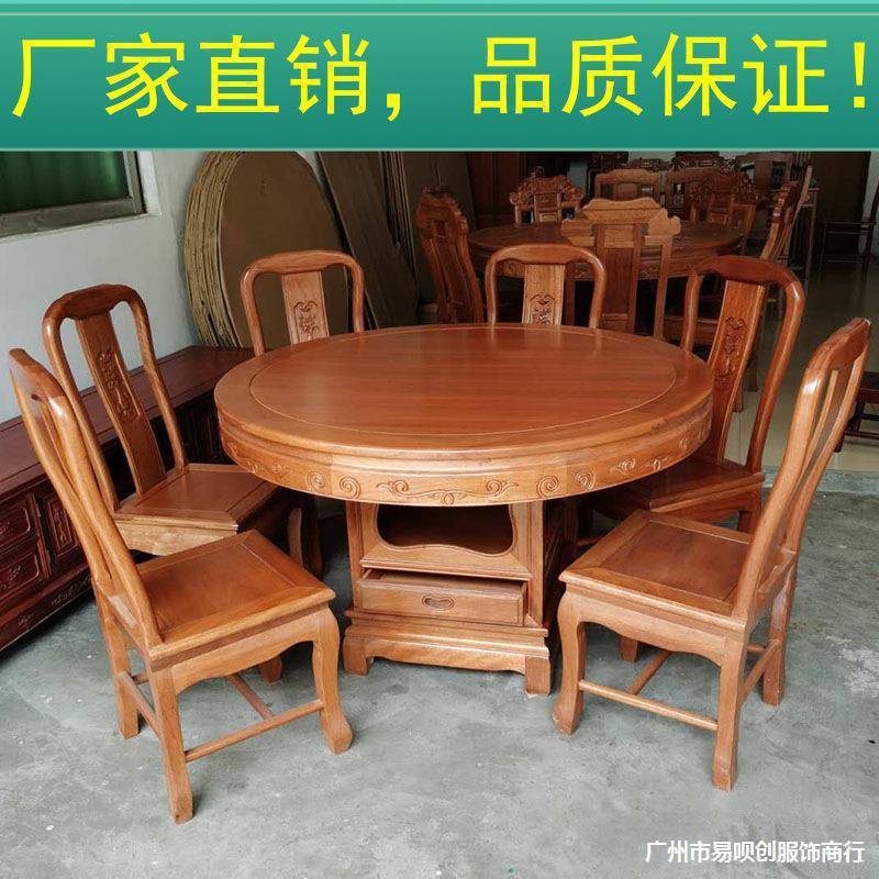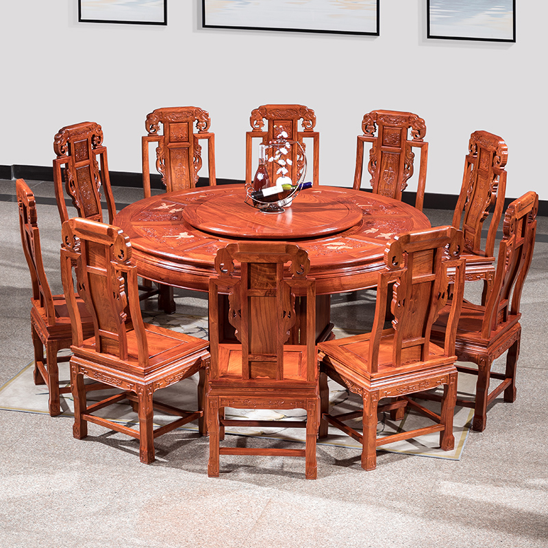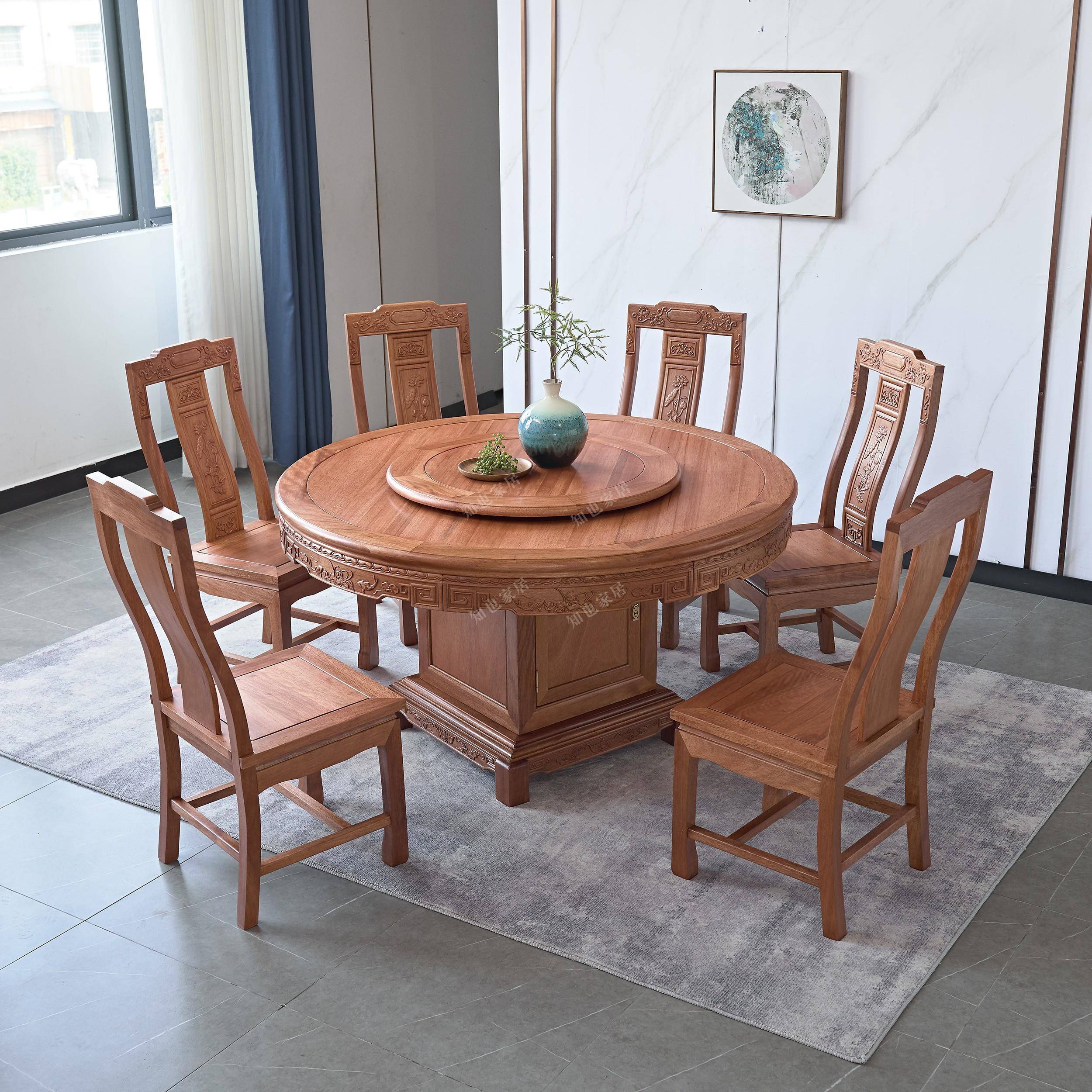 花梨木实木餐桌组合菠萝格木家用餐桌仿古雕花带转盘红木餐桌圆桌