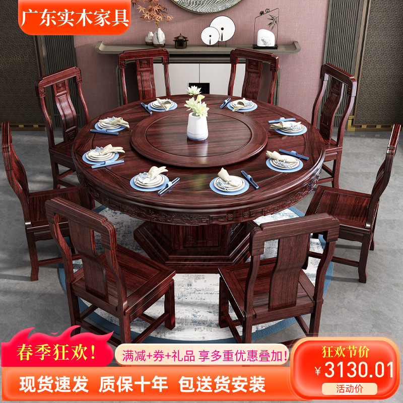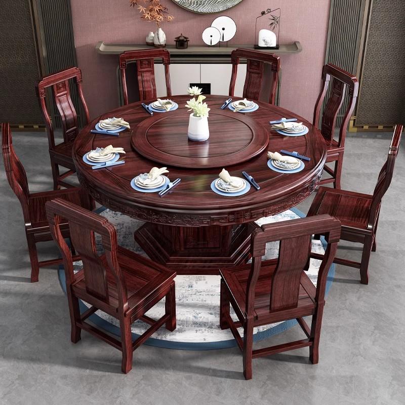 红木餐桌圆桌家用实木餐桌椅组合鸡翅木家具吃饭桌子带转盘大圆桌