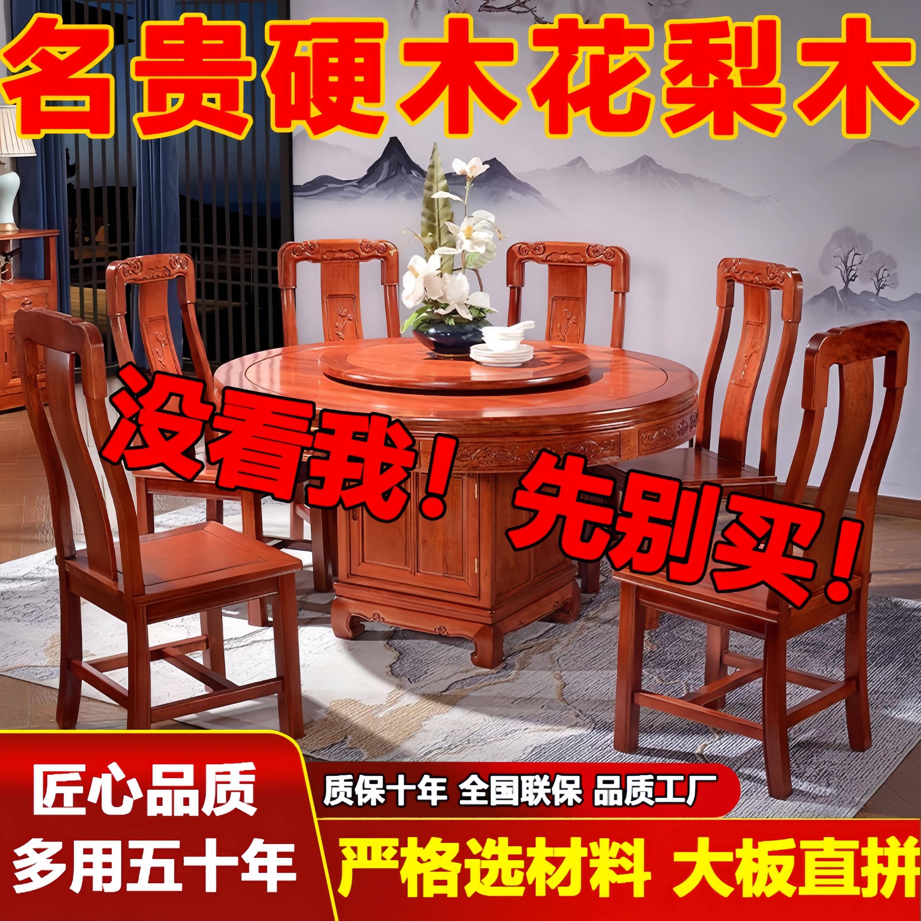 全实木花梨木餐桌椅组合菠萝格木雕花家用红木吃饭桌带转盘大圆桌