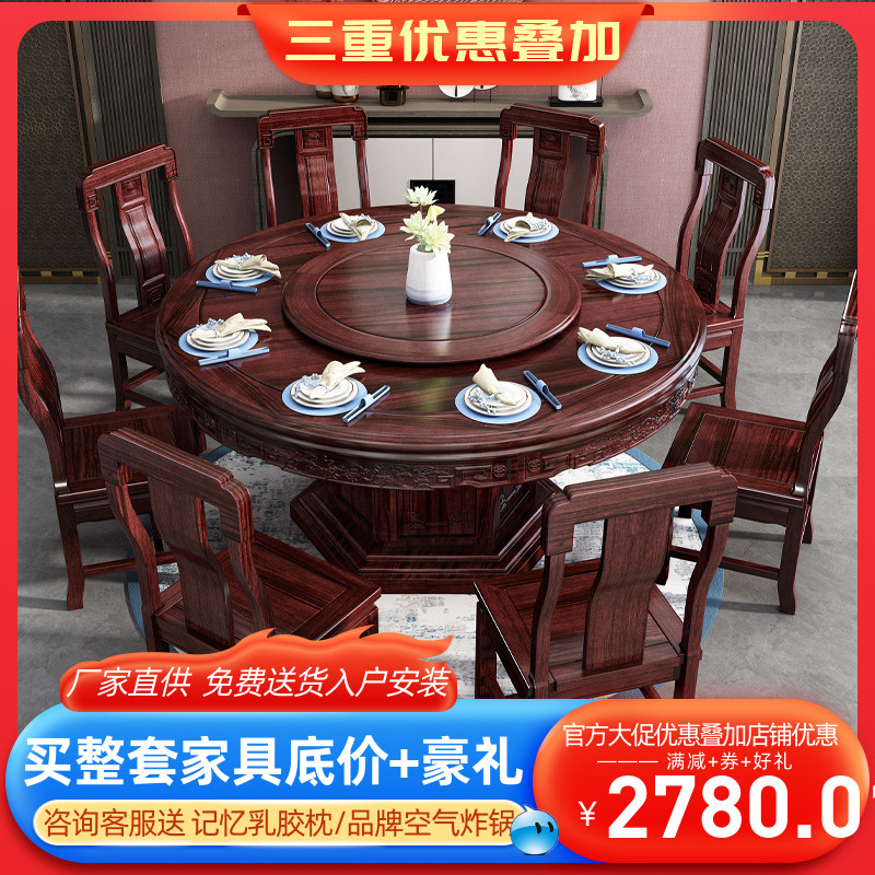 全实木餐桌椅组合中式高端黑檀木家用雕花圆桌带转盘红木餐厅饭桌
