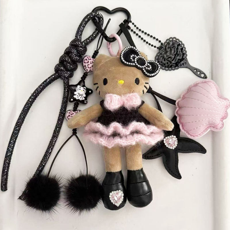 抖音同款KT包包挂件甜酷黑粉毛衣长腿黑皮手工编织钥匙扣毛绒挂饰