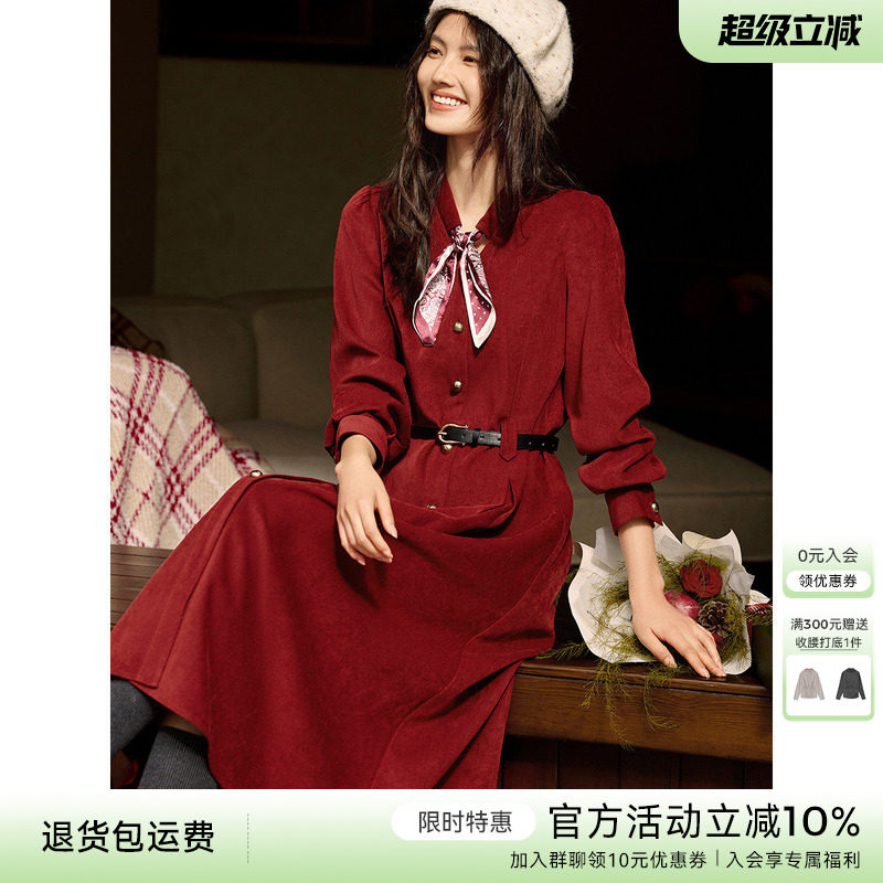 XWI欣未法式优雅丝巾领红色连衣裙女冬季磨毛长款婚宴礼服衬衫裙