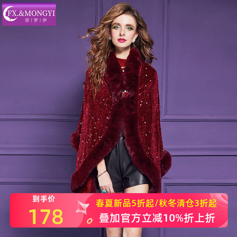 菲梦伊大毛领亮片红色披肩外套女冬季高端加厚保暖贵妇斗篷式上衣