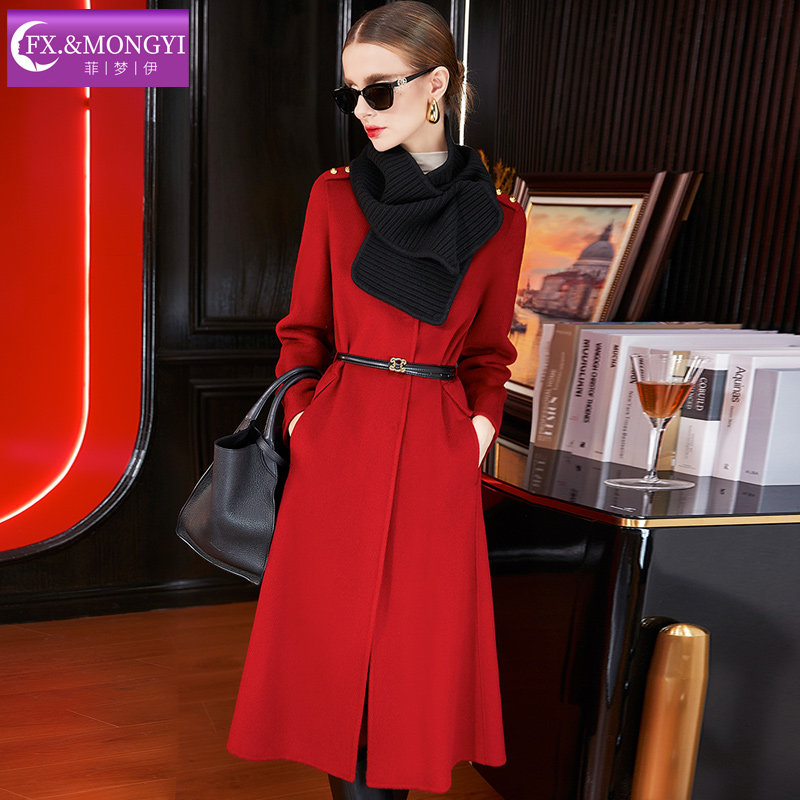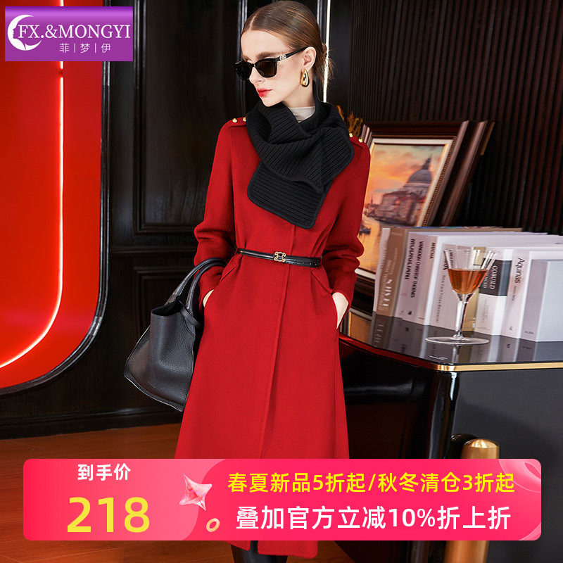 菲梦伊红色羊毛大衣女冬季本命年轻奢高贵气质中长毛呢外套送围脖