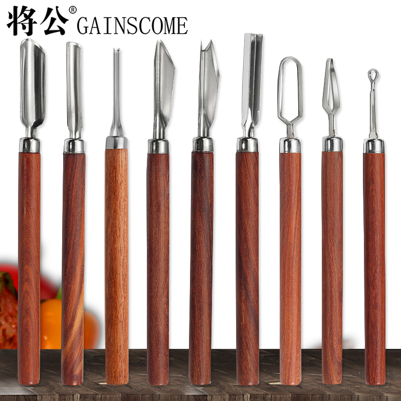 将公水果雕刻刀不锈钢U型戳刀V拉刻刀红檀手柄厨师食品雕花刀包邮