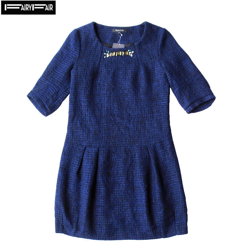 春秋款 FAIRYFAIR 正品 蓝黑织毛呢圆领钉珠水钻中袖连衣裙